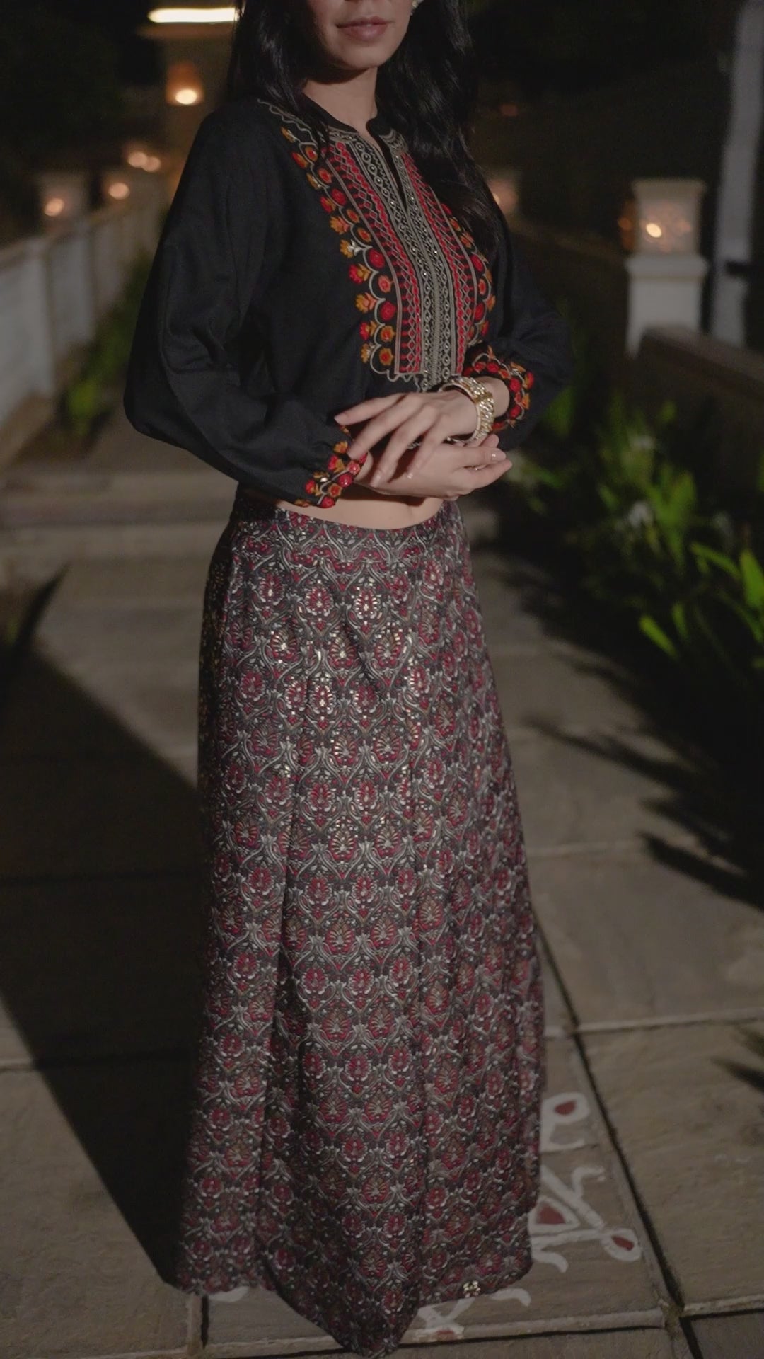 Black Thread Embroidered Rayon Top & Printed Skirt Set With Beads & Mirror Work