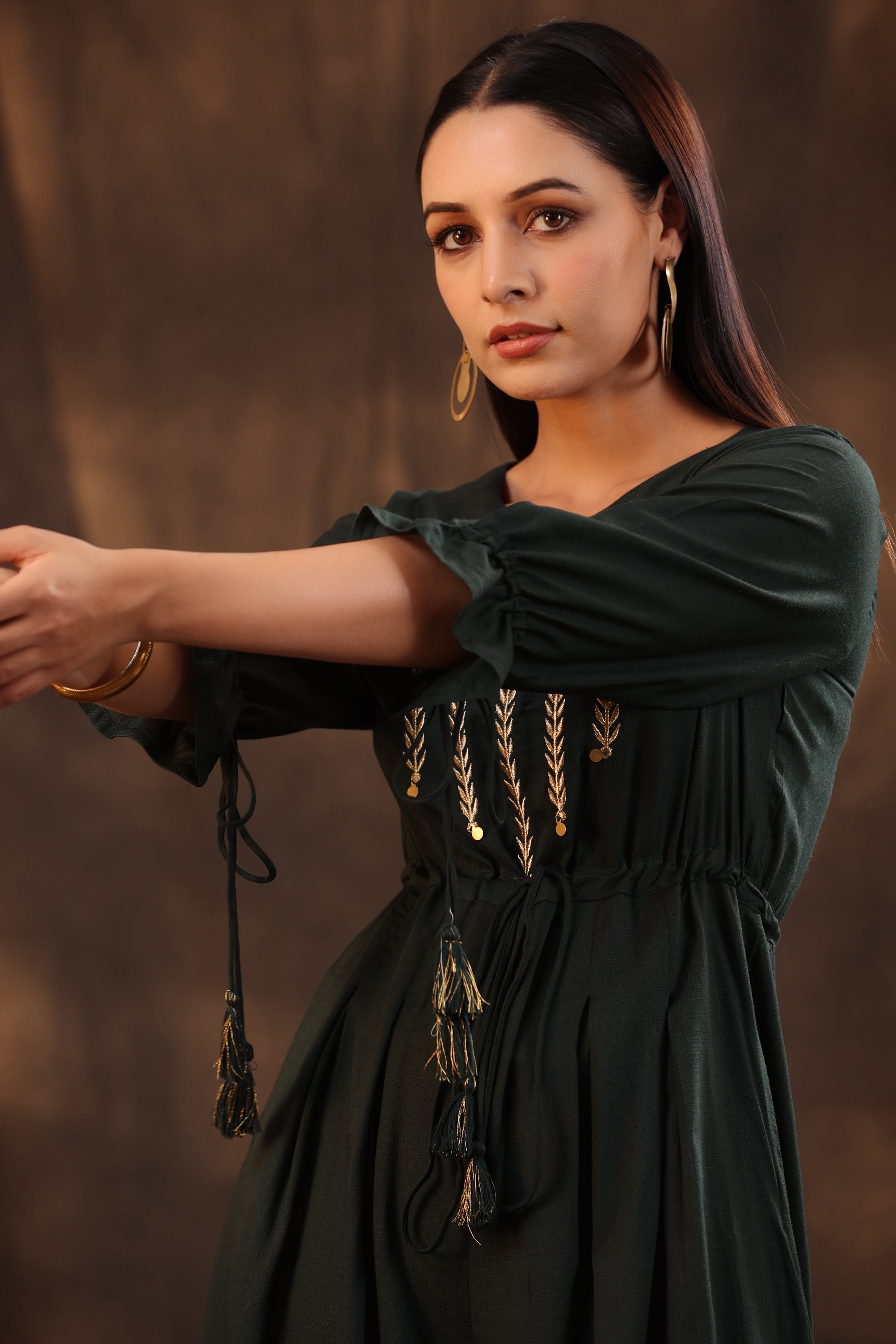 Juniper Jade Green Ethnic Motif Printed Rayon Slub Jumpsuit With Zari Work Embroidery