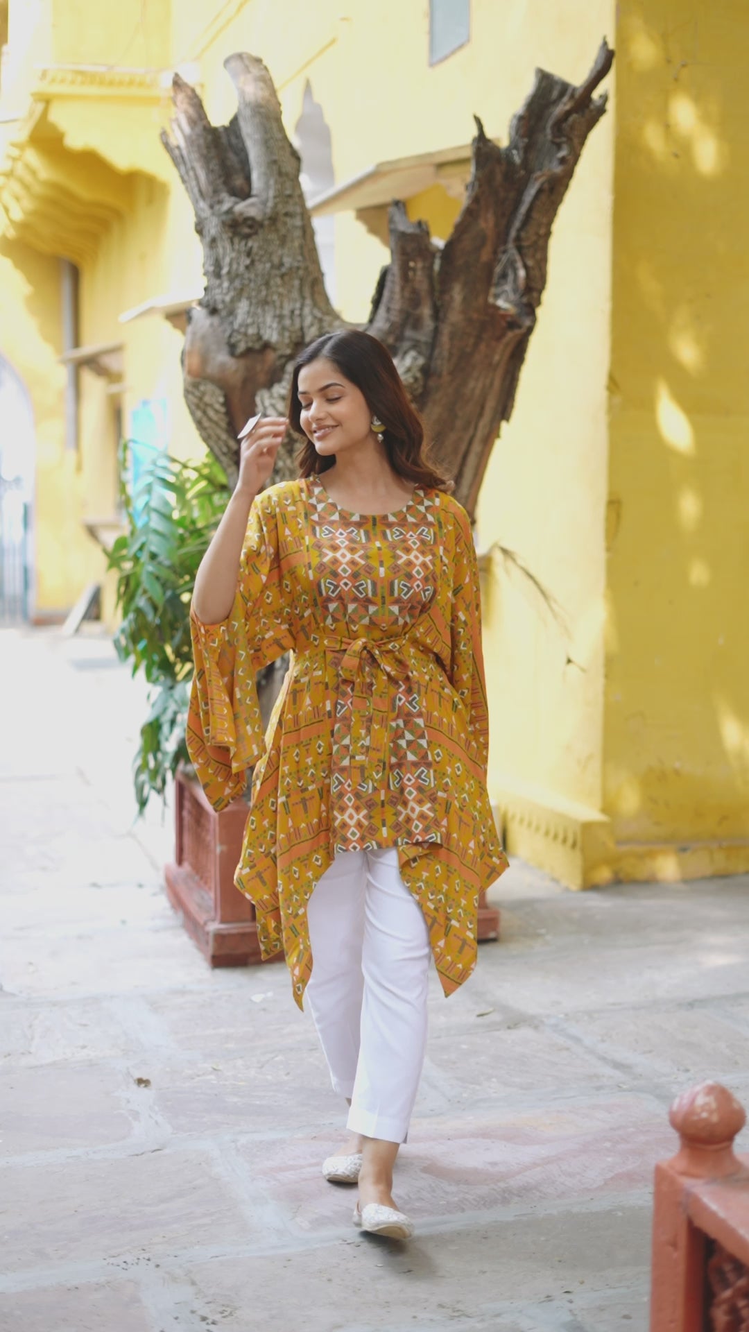Juniper The Crafted Geometrics Mustard Ikat Printed Rayon Kaftan Dress
